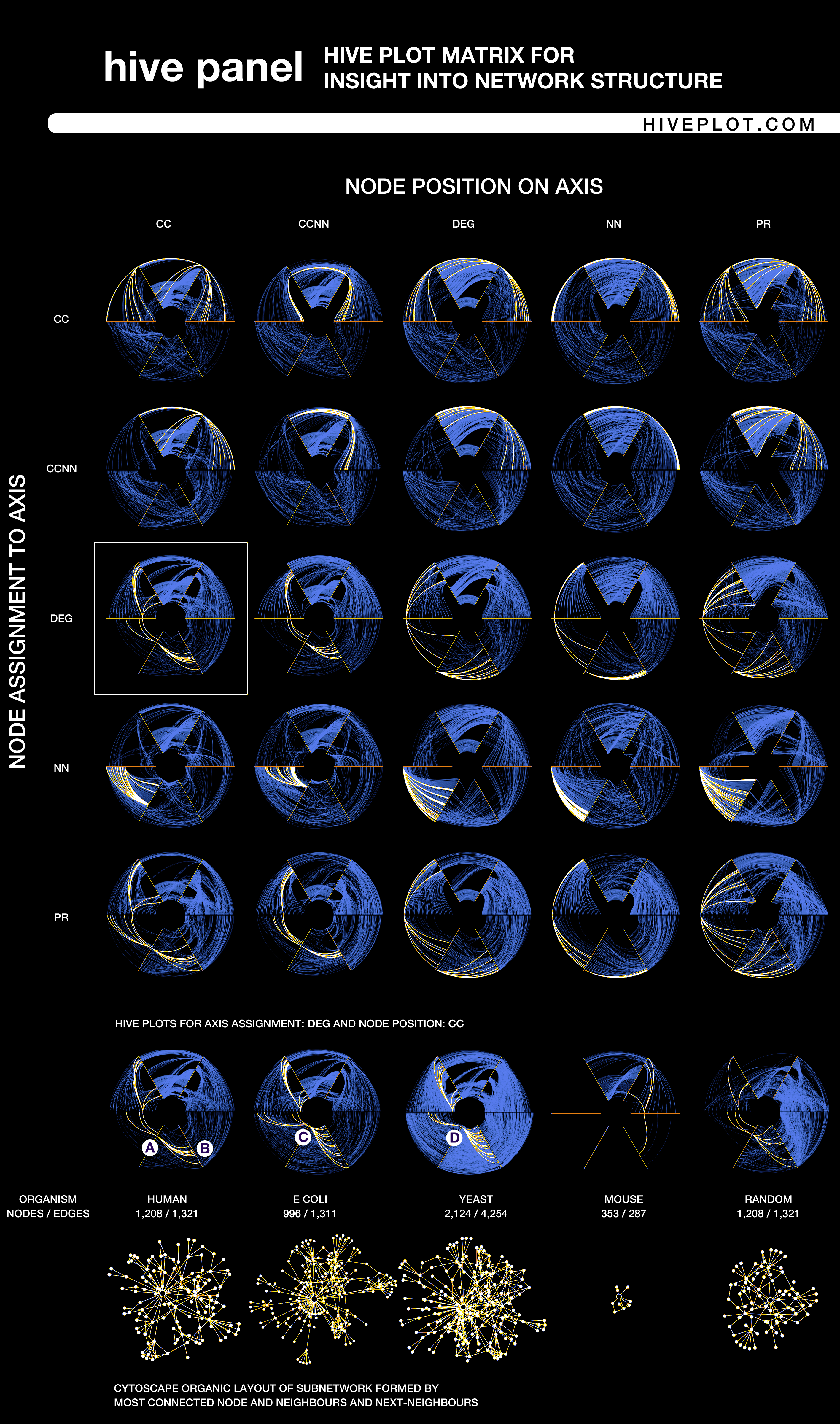 A single hive plot (deg vs cc) from hive panels of four organisms and a random network are shown below the human panel to demonstrate differences in connectivity and clustering coefficient. Shown also are organic layouts of the locale of the most connected node formed by its neighbors and next-nearest neighbors, the region of the network highlighted in the hive plots. Though it is not possible to confidently conclude anything from the organic layouts, the hive plots clearly communicate differences in a quantitative manner. For example, the most connected node in the human set (A) is more cliquey (large cc) than E. coli (C) and yeast (D) and is connected to nodes which themselves are uniformly cliquey (B). These and other patterns can be quickly identified within the panel.