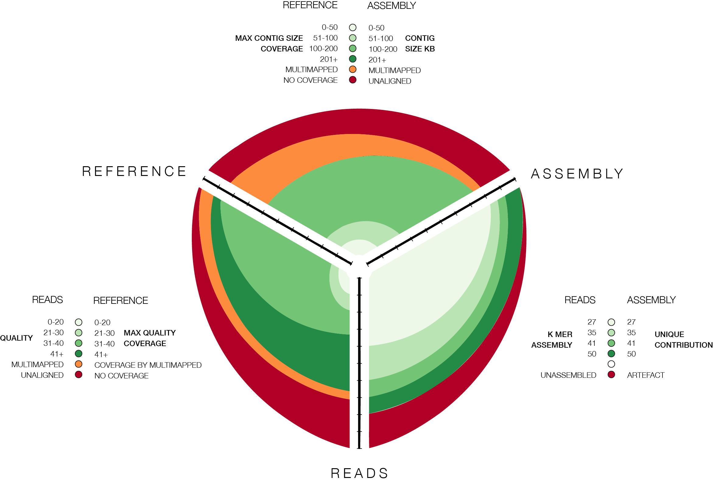 This hive plot provides a visual recipe for assessing the quality of a genomic assembly. An assembly is composed of reads (bottom axis), which are assembled into contigs (right axis). Independently, a reference assembly (left axis) may exist and act as a comparator. Among others, this hive plot answers the following questions: