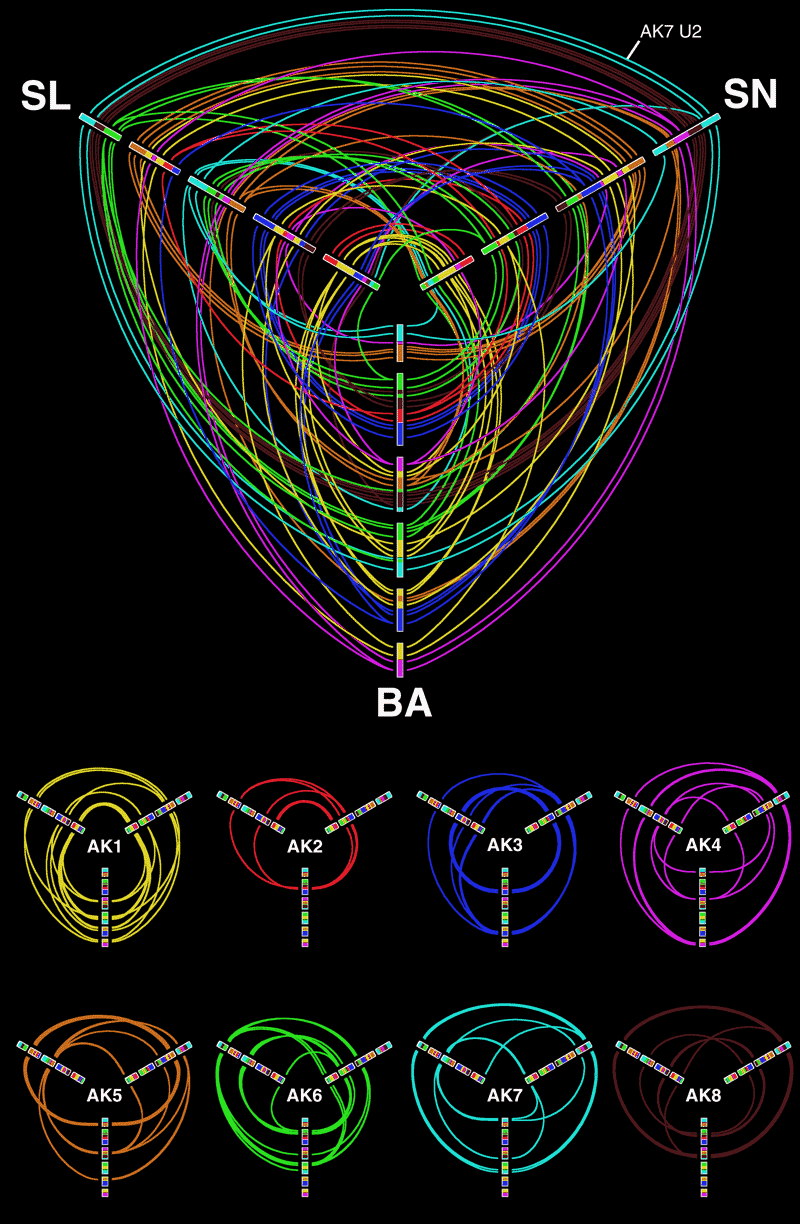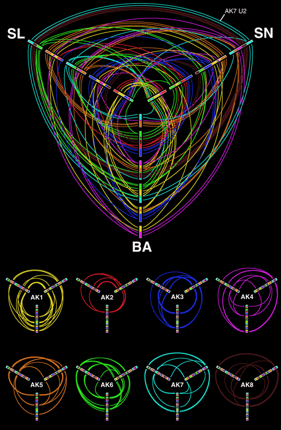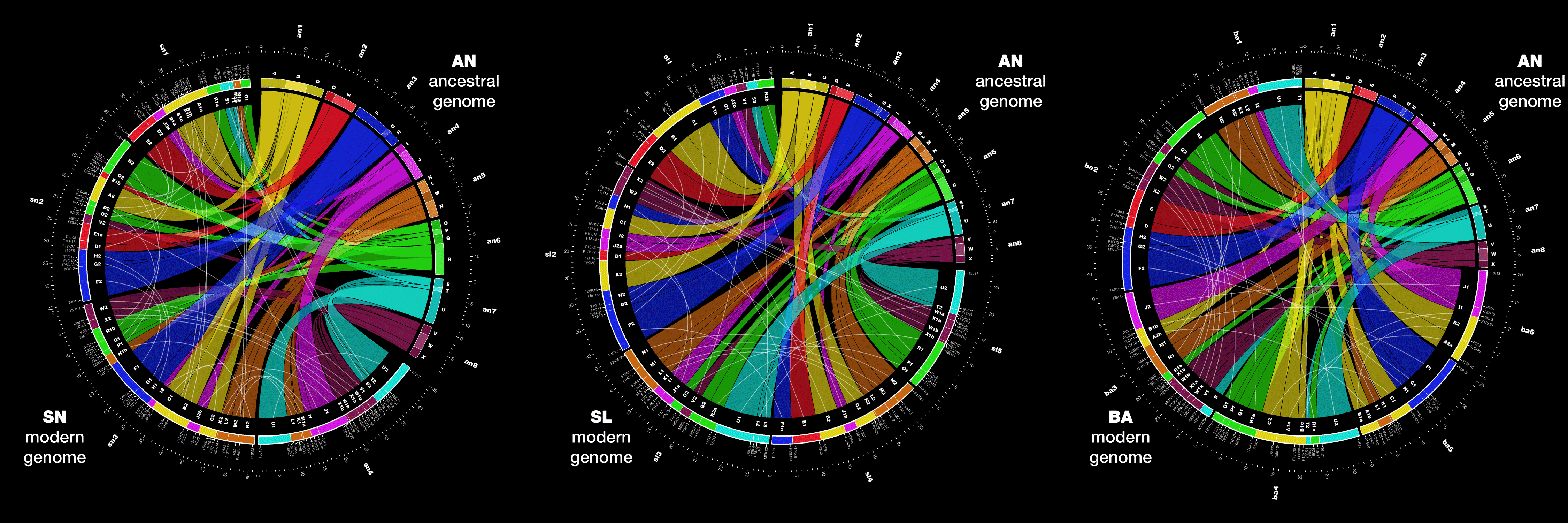 Hive plots make an excellent tool for showing three-way alignments. Below is a hive plot of all three alignments shown above. In this representation, positions on modern genomes that align to the same ancestral genome segment are connected.