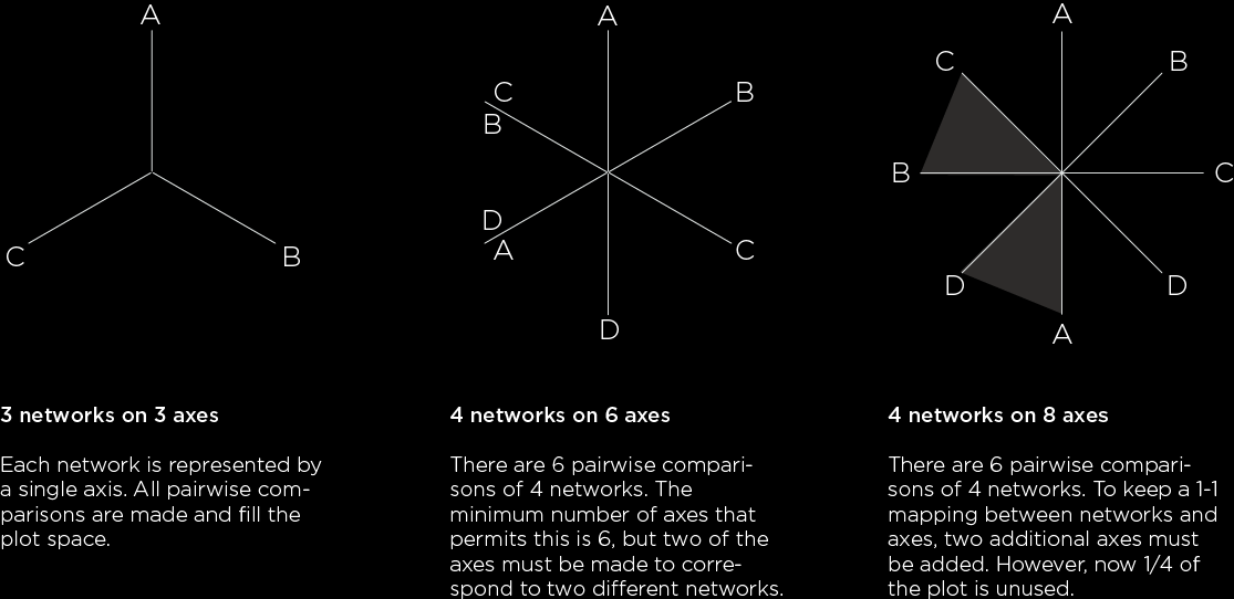 Comparing four networks requires 6 axes, if the plot area is to be fully used.