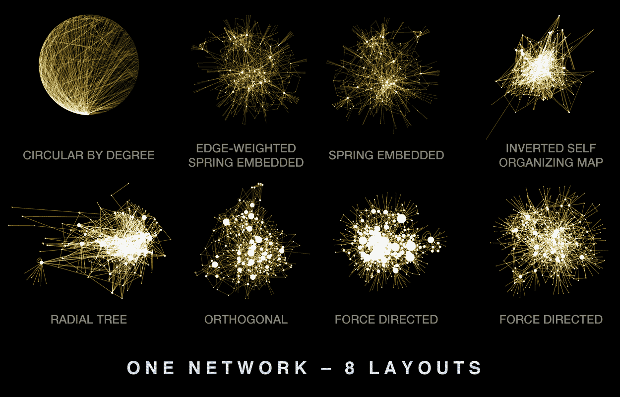 Interpretation of the linear visualization is easy (once you get the hang of it). Direct visual comparison of hive plots is possible — a valuable and distinguishing feature of hive plots. For example, consider the eight hairballs below — they are layouts of the same network. It is not possible to tell that this is in fact the same network.