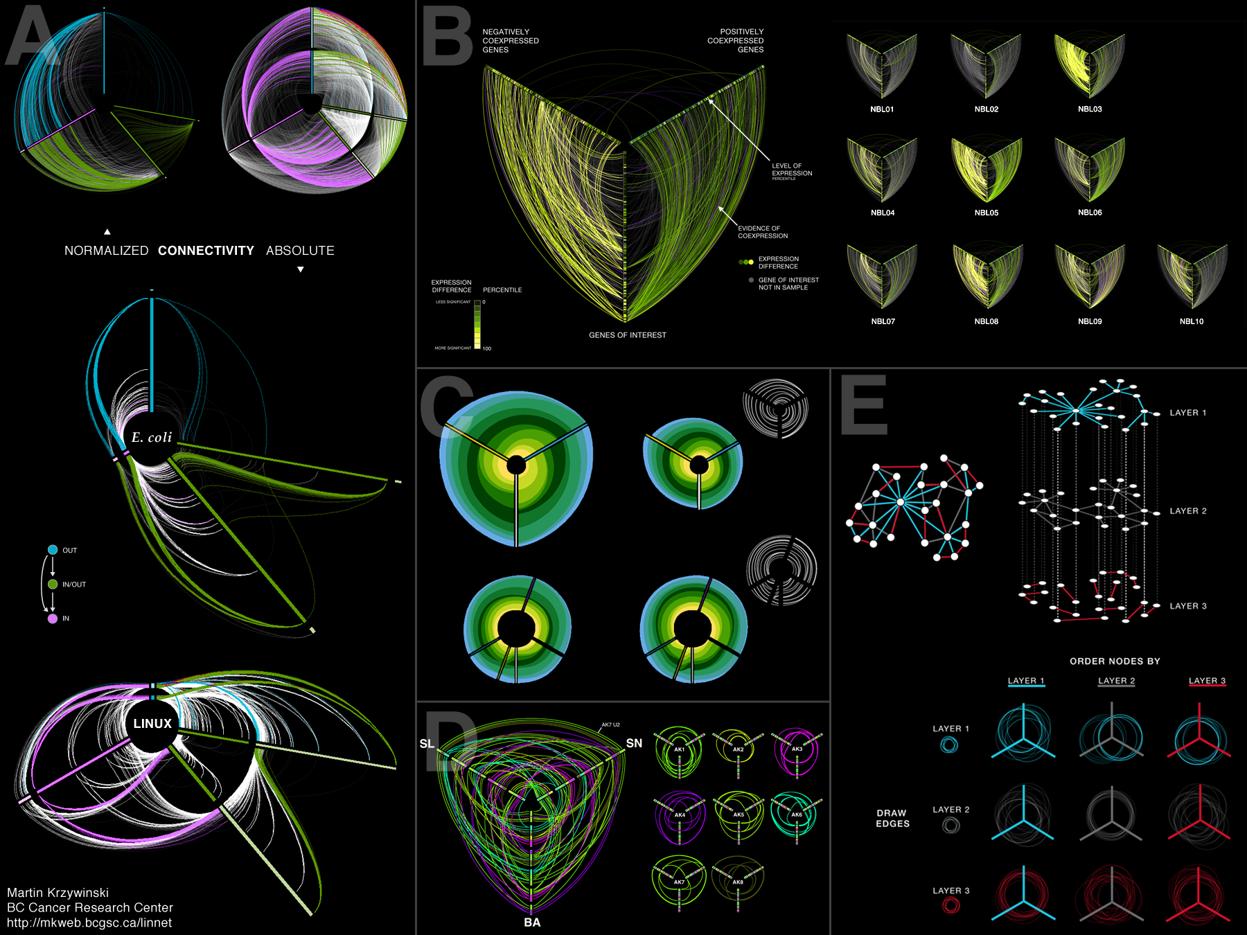 Nodes are assigned to one of three (or more) axes, which may be divided into segments. Nodes are ordered on a segment based on properties such as connectivity, density, centrality or quantitative annotation (e.g. gene expression). The user is free to choose whatever rules fit their data and visualization requirements. Edges are drawn as Bezier curves, which can be annotated with color, thickness or label to communicate additional information.